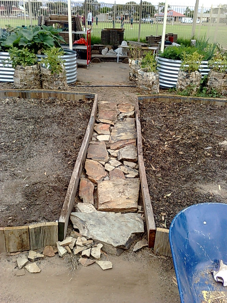 | The Eat Well / Be Active Garden - with rhubarb, artichokes, onions, garlic and herbs growing nicely |